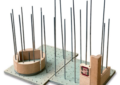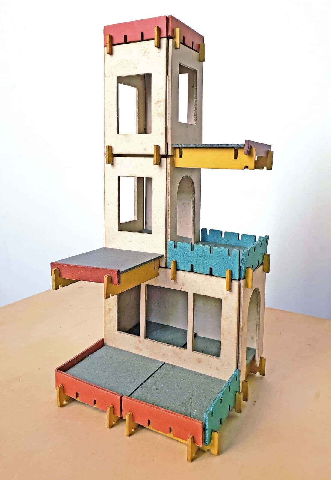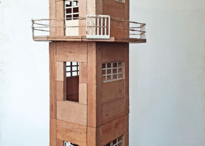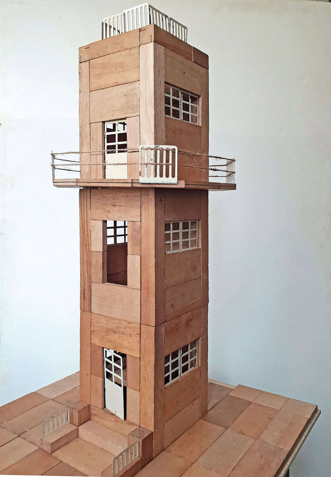 Die im Baukasten ,,Aussichtsturm mit Aufzug“ der Firma Spranger enthaltenen Buchenholzelemente werden mit flachen Metallteilen verbunden. Durch die diskreten Verbindungsteile sind die Ergebnisse homogener als andere Modelle, es stehen z.B. keine Noppen hervor. ‚ Foto: Sammlung Claus Krieger