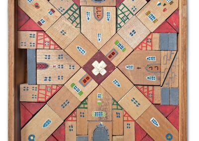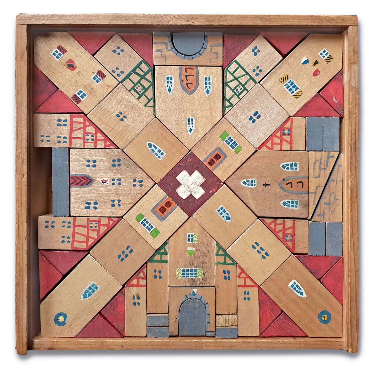 Der Baukasten des Herstellers ,,Hofmann“ umfasst 50 bunt bemalte Holzbausteine, die sich zu einer kleinen Stadt anordnen lassen. Das Schweizerkreuz in der Mitte des Kastens kennzeichnet den Produktionsort. Foto: Sammlung Claus Krieger