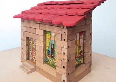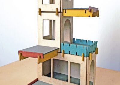 Der Baukasten „Châteaux & Chaumières“ bietet ein Stecksystem aus Buchenholzbausteinen. Farbige Zeichnungen von Innenräumen lassen sich als Fenster und Türen einsetzen und verleihen den Häusern eine besondere räumliche Tiefe und Ausdruckskraft. Foto: Sammlung Claus Krieger