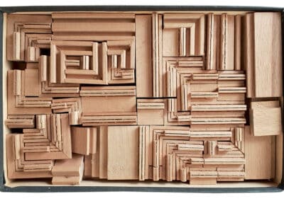 Aufgrund des eher ungewöhnlichen Verbindungssystems der Holzbausteine mittels Metallstäben ist ein intuitives Bauerlebnis mit dem Baukasten „Bâtiss“ nur eingeschränkt möglich. Später erschien daher die Variante „Baticlub“ für jüngere Kinder, die gänzlich ohne Metallverbindungen auskommt. Foto: Sammlung Claus Krieger