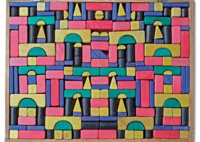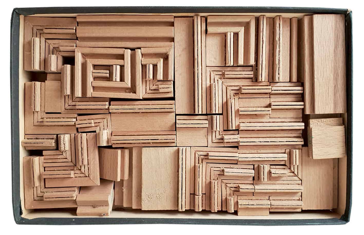 Die Bausteine aus gefärbtem Nadelholz sind so arrangiert, dass sich bereits beim Öffnen der Verpackung ein attraktives Bild ergibt. Es erinnert an Gemälde von Paul Klee. Foto: Sammlung Claus Krieger