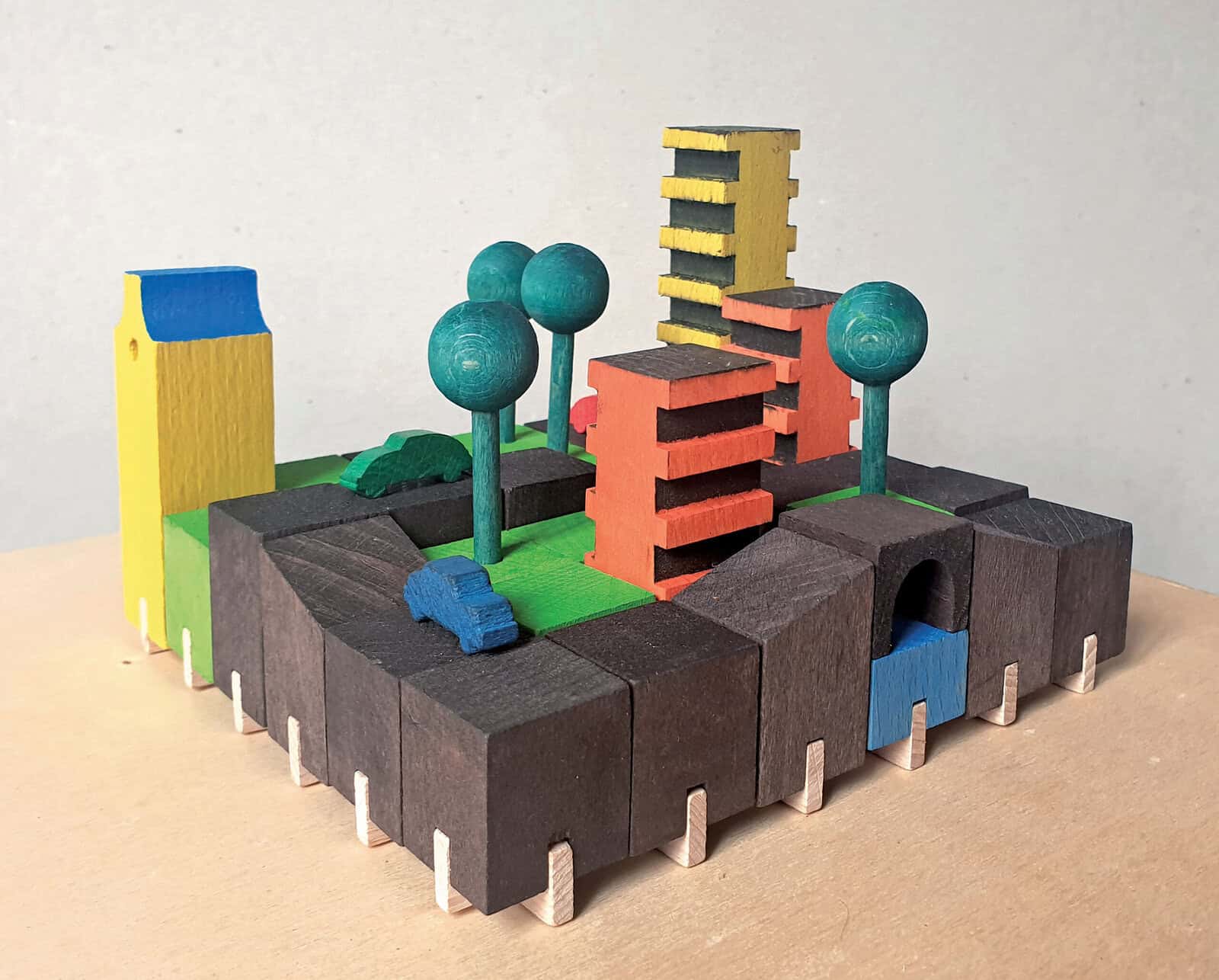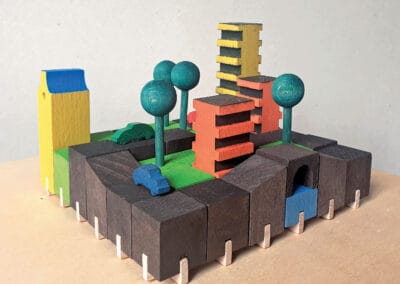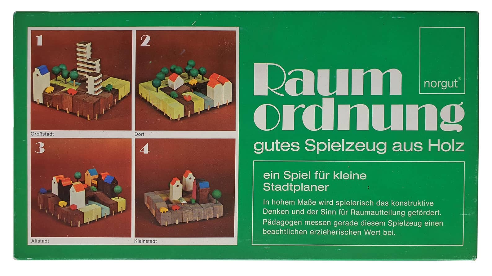 In den 1970er Jahren brachte die Firma Norgut den Baukasten „Raumordnung“ auf den Markt. Mit seinen 49 Holzbausteinen lassen sich auf einem Grundraster vielfältige Varianten der Stadtplanung als eine Art Relief realisieren. Foto: Sammlung Claus Krieger